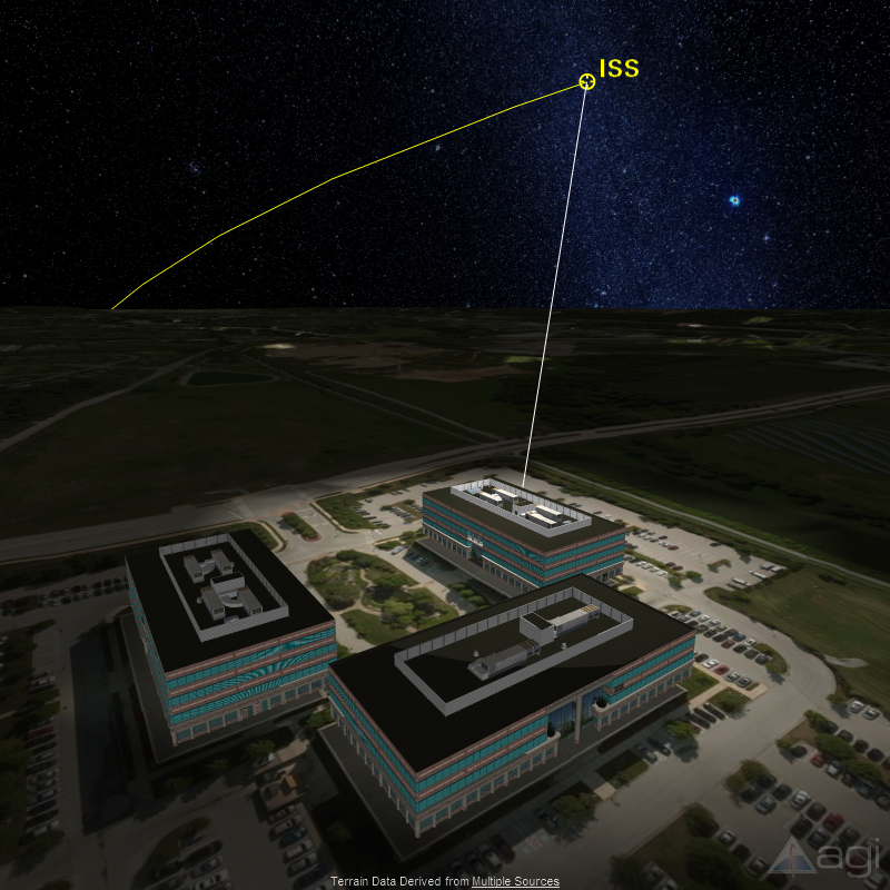 There are certain conditions that must be met in order for you to see the ISS with your naked eye. You can model those conditions in STK as well! You can set lighting constraints so the only times you can see the ISS is when you are in darkness and the ISS is illuminated. Then you can also model an elevation angle constraint to take into account the terrain around you or you can bring in actual 3D terrain!