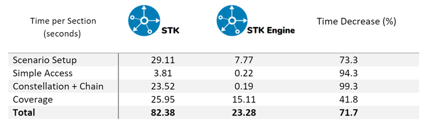 To compare the computation speed of STK Engine in “NoGraphics” mode to the STK desktop application, I wrote an example Python script that runs and times both as they compute a simple access, set up a satellite constellation and chain, and compute a coverage definition. You can see the results in the table below.